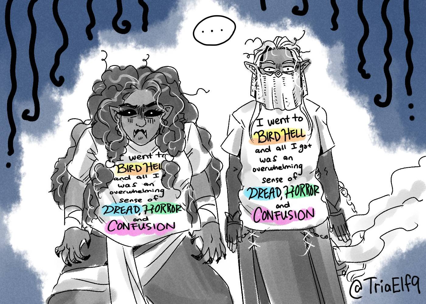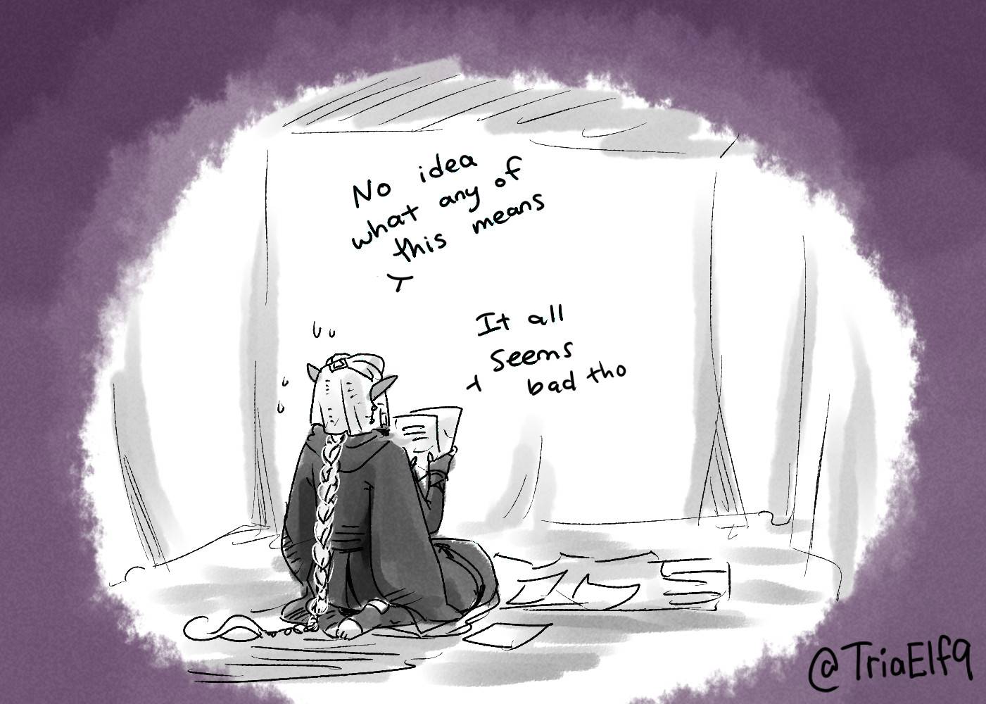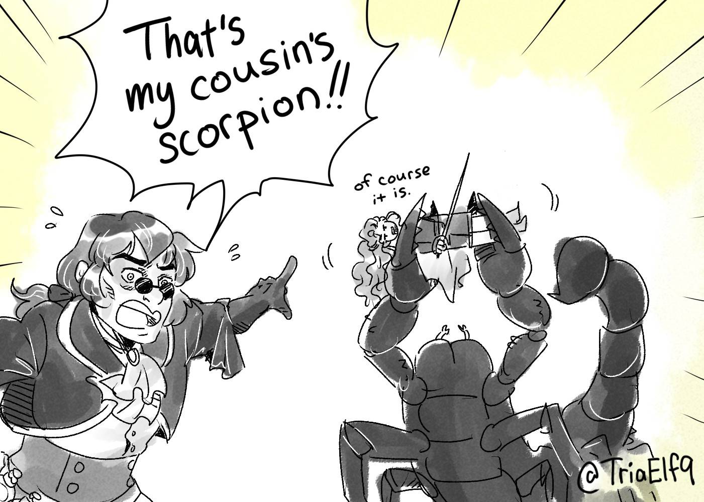 These doodles are from the newest episode of Critical Role. Do not read past this if you have not seen the most recent CR episode and don't want to be spoiled! This is your final warning! This is your final warning! Doodles will now commence! When you get trauma as a souvenir The Tachonis v Julien rivalry continues via the scorpion XD Look, Vaelus reads a LOT. She can find so much info b/c of all that comprehension XD ~If you like this week's doodles and want a print of one, I sell postcard prints of them made to order on my ko-fi shop!~ Get one here, or a set of 5 here! |