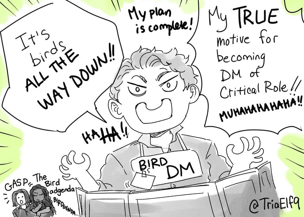 These doodles are from the newest episode of Critical Role. Do not read past this if you have not seen the most recent CR episode and don't want to be spoiled! This is your final warning! This is your final warning! Doodles will now commence! WE HAVE FALLEN INTO HIS BIRD TRAP THE BIRDGENDA IS ALL BIRDS ALL THE TIME NOOO XD It's going GREAT Julien doing sweet flips and tricks and being all dramatic and cool in all his moves, whether or not he succeeds, b/c Matt's so good at words XD ~If you like this week's doodles and want a print of one, I sell postcard prints of them made to order on my ko-fi shop!~ Get one here, or a set of 5 here! |