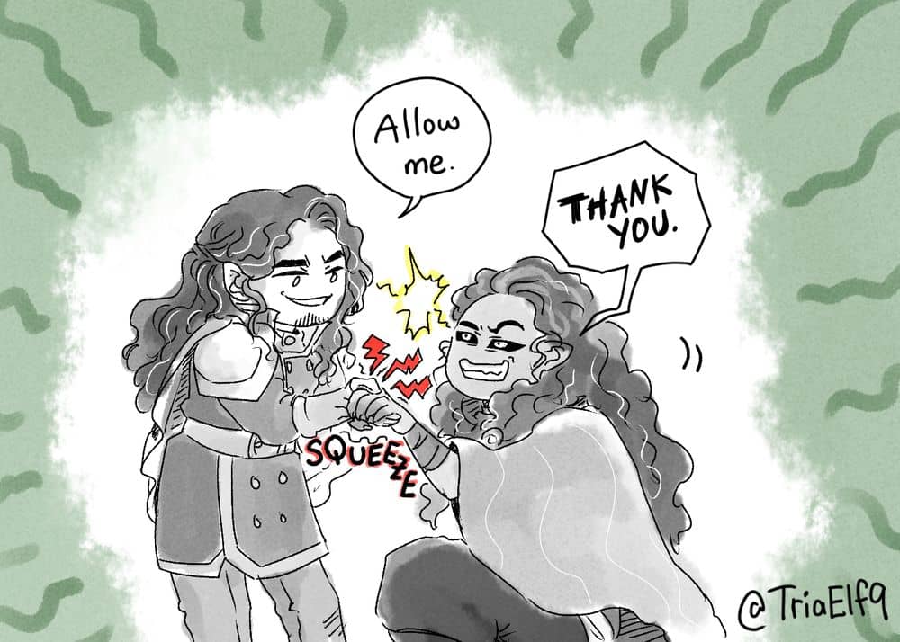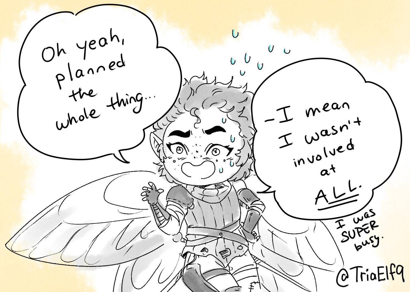 These doodles are from the newest episode of Critical Role. Do not read past this if you have not seen the most recent CR episode and don't want to be spoiled! This is your final warning! This is your final warning! Doodles will now commence! Nothing like spiteful politeness XD AHAH aww, she's fun XD Looking through your animal's eyes was always creepy, but when it's your undead animal (that you made?)'s BUTTON eyes and you're a necromancer... that WAY ups the creepy factor XD YES YES YES BISEXUAL DISASTER! BISEXUAL DISASTER!! MATT, MORE OF THIS GREMLIN MAN, PLEASE I'M LIVING FOR EVERY SECOND OF HIS MESSY, MESSY LIFE XD ~If you like this week's doodles and want a print of one, I sell postcard prints of them made to order on my ko-fi shop!~ Get one here, or a set of 5 here! |